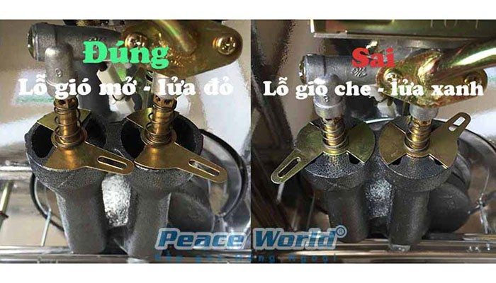 Lưu ý: khi vận chuyển có thể làm lệch cần gạc chỉnh gió, khiến lửa yếu (xanh). Quý khách hàng cần chỉnh lại cần gạc chỉnh gió phía dưới bếp như hình vẽ đúng bên trái :