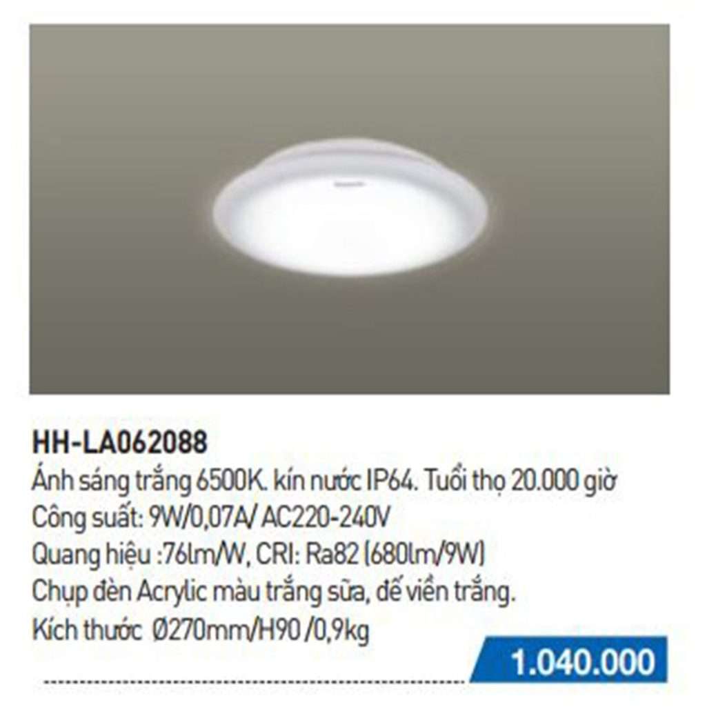 Đèn trần kín nước Led Panasonic HH-LA062088 được nghiên cứu và sản xuất trên dây chuyền công nghệ cao, sản phẩm là loại đèn chống thấm nước, với đèn Led lắp trong, bộ cấp nguồn lắp trong thiết bị chiếu sáng của căn nhà sẽ an toàn hơn, môi trường sống của bạn cũng được cải thiện đáng kể. Với mẫu mã, màu sắc tinh tế, sang trọng người tiêu dùng có thể lựa chọn bố trí lắp đặt đèn ở nhiều vị trí phù hợp như phòng bếp, phòng khách và phòng ngủ mỗi gia đình, tô điểm thêm cho không gian sống riêng của mỗi gia đình.