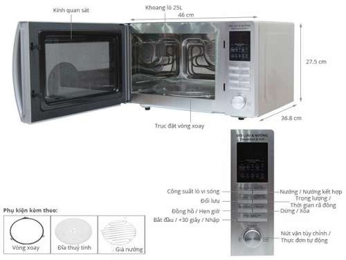 - Công suất của chiếc lò: Khoảng 900W – 1400W cho bạn hâm, nướng, rã đông mau chóng. Ngoài ra dung tích có thể chứa khoảng 25 lít thích hợp cho 4-6 người.