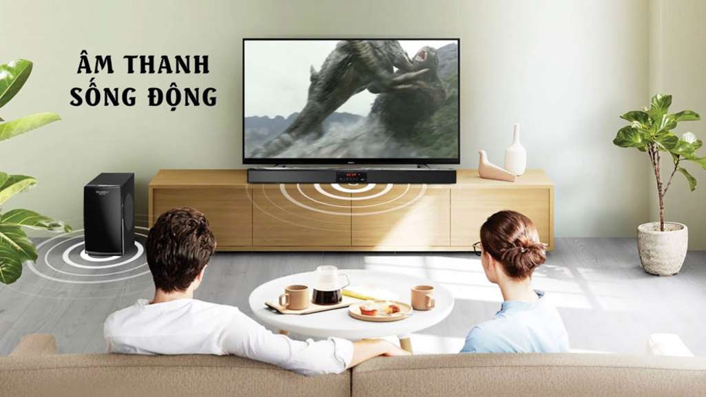 - Hệ thống loa soundbar 2.1, cho âm thanh trong trẻo, rõ ràng, âm trầm mạnh mẽ nghe được nhiều thể loại nhạc.