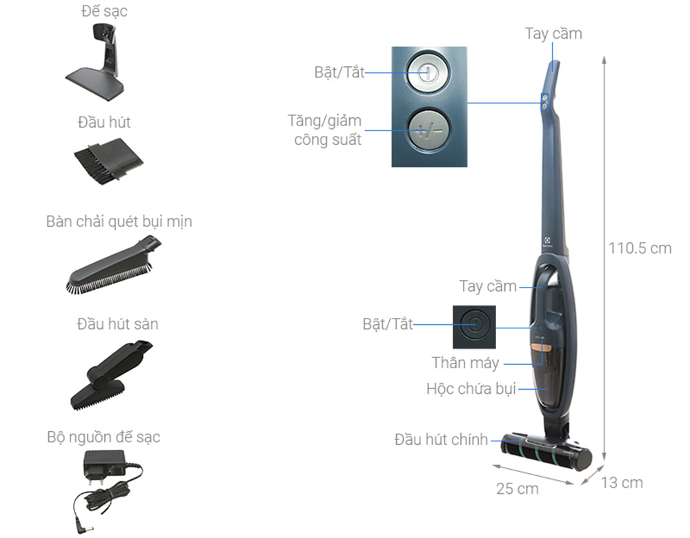 Máy hút bụi không dây Electrolux có thể tự đứng vững 90 độ không cần đế sạc, bảo quản gọn gàng, tiết kiệm không gian. Máy sử dụng loại pin 18V DC Li-Ion, sạc đầy trong 4.5 giờ, sử dụng khoảng 45 phút. Có đèn báo dung lượng pin tiện quan sát lượng pin để sạc kịp thời. Hộp chứa bụi 0.3 lít, dễ dàng tháo lắp và vệ sinh. Máy hút bụi cho xe hơi nhỏ gọn, dễ di chuyển, thiết kế nút điều khiển trên tay cầm, nhờ đó bạn không cảm thấy mỏi cổ tay và thuận lợi khi sử dụng.