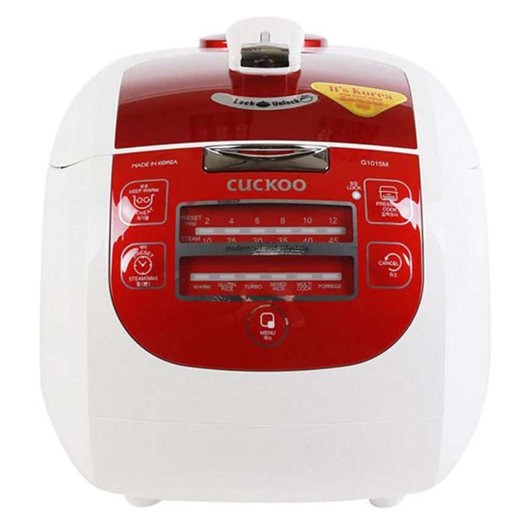 Nồi cơm - Áp suất điện tử 1.8 L Cuckoo CRP-G1015M-R hoạt động với công suất 1150W, có thiết kế nhỏ gọn, sang trọng, có kích thước ngang 30 cm, cao 29 cm, sâu 36 cm, trọng lượng 6.8 kg thích hợp sử dụng nấu cơm cho gia đình có 4-6 thành viên, hơn nữa nồi còn giúp làm sáng không gian bếp nhà bạn. Vỏ nồi bằng nhựa dễ làm sạch khi bị bẩn, thiết kế nhiều lớp dày, giữ thức ăn luôn nóng hổi, thơm ngon.